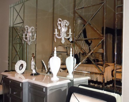 Custom designed beveled mirrored wall with custom bedroom furniture designs.